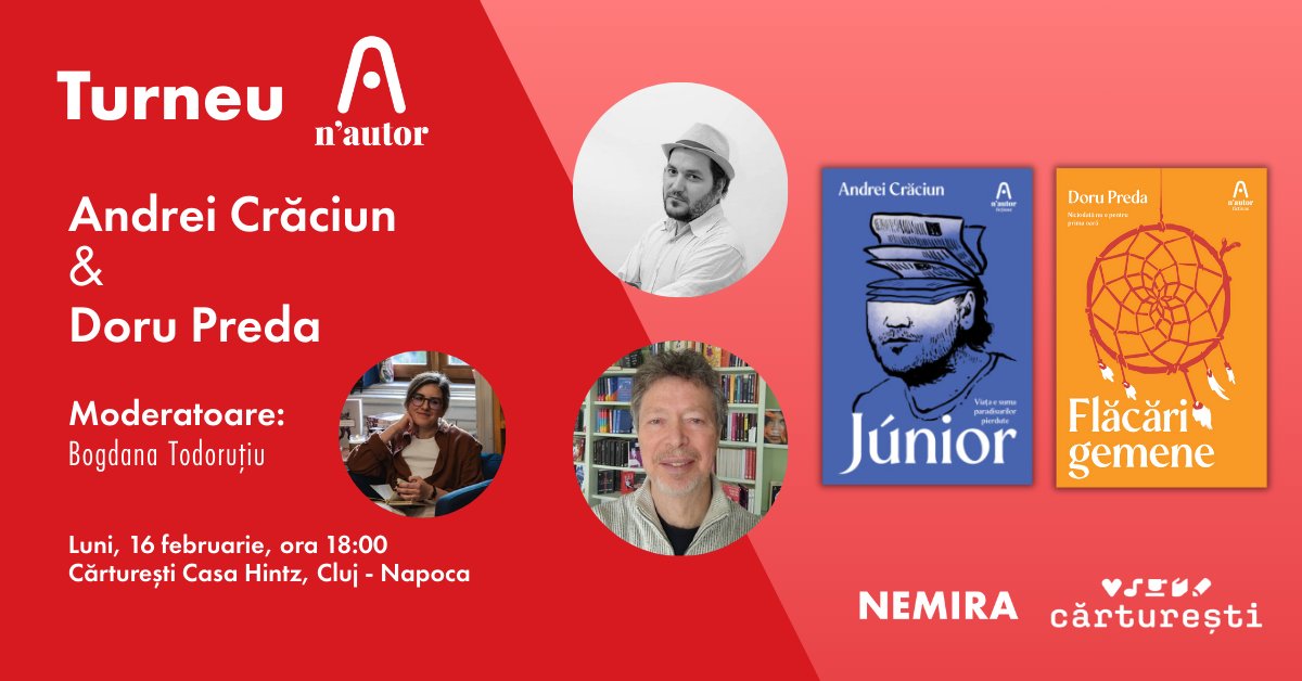 - 18:00 – Turneu n’autor: Andrei Crăciun și Doru Preda la Cluj – Cărturești Casa Hintz