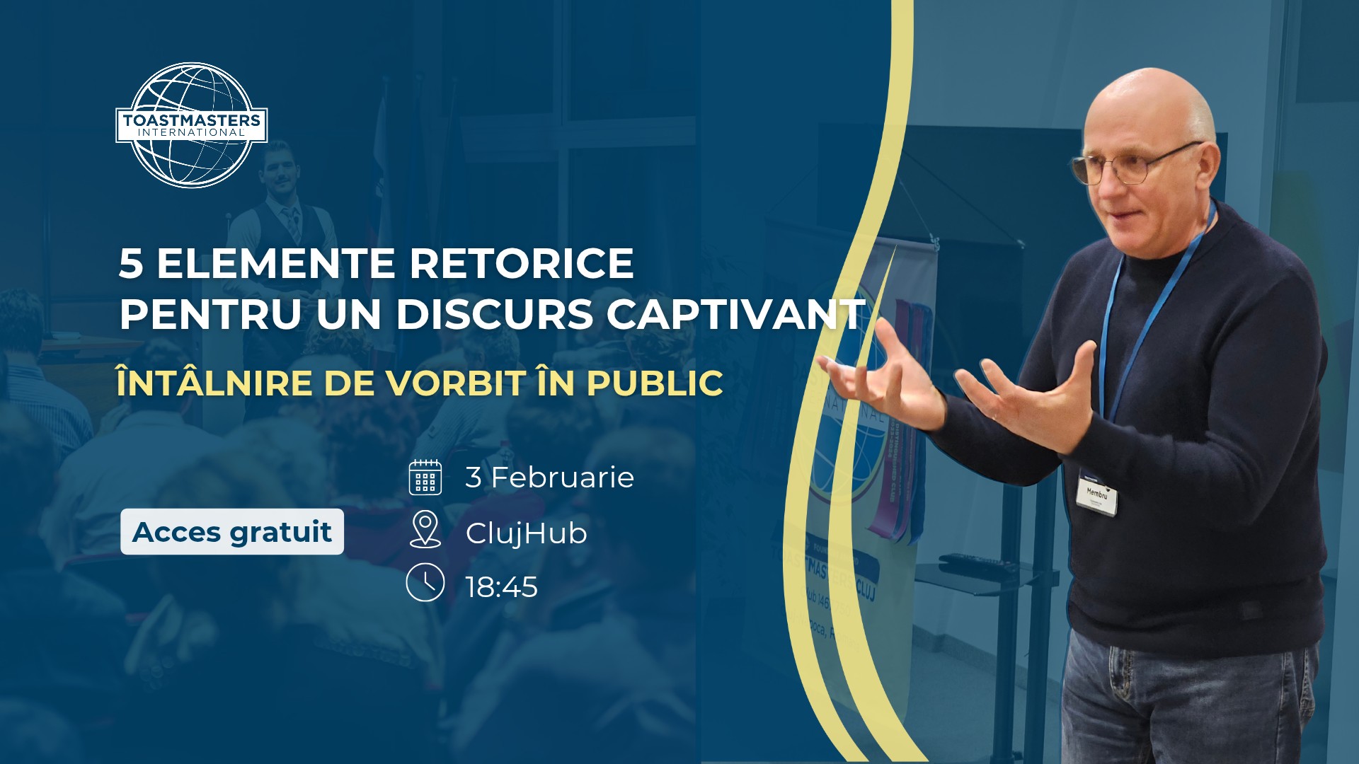 - 18:45 – Întâlnire Gratuită de Vorbit în Public – Toastmasters Cluj – ClujHub