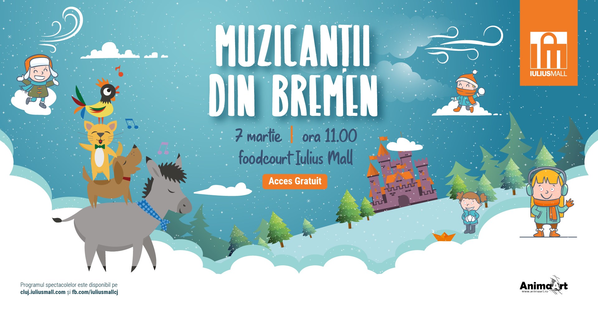 - 11:00 – Kids Saturday – Muzicanții din Bremen – Iulius Mall Cluj-Napoca