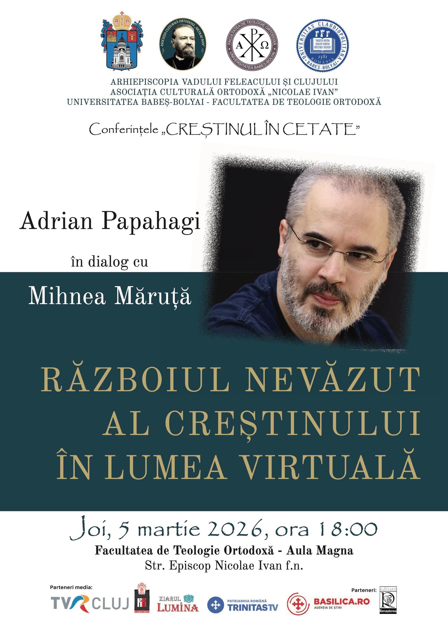 - 18:00 – Războiul nevăzut al creștinului în lumea virtuală – UBB – Facultatea de Teologie Ortodoxă Cluj-Napoca