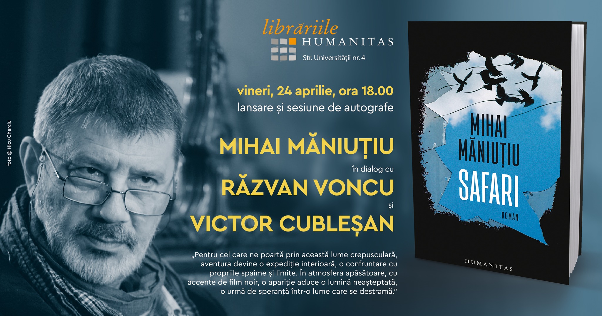 - 18:00 – „Safari” – Mihai Măniuțiu în dialog cu Victor Cubleșan și Răvan Voncu – Librăria Humanitas Cluj