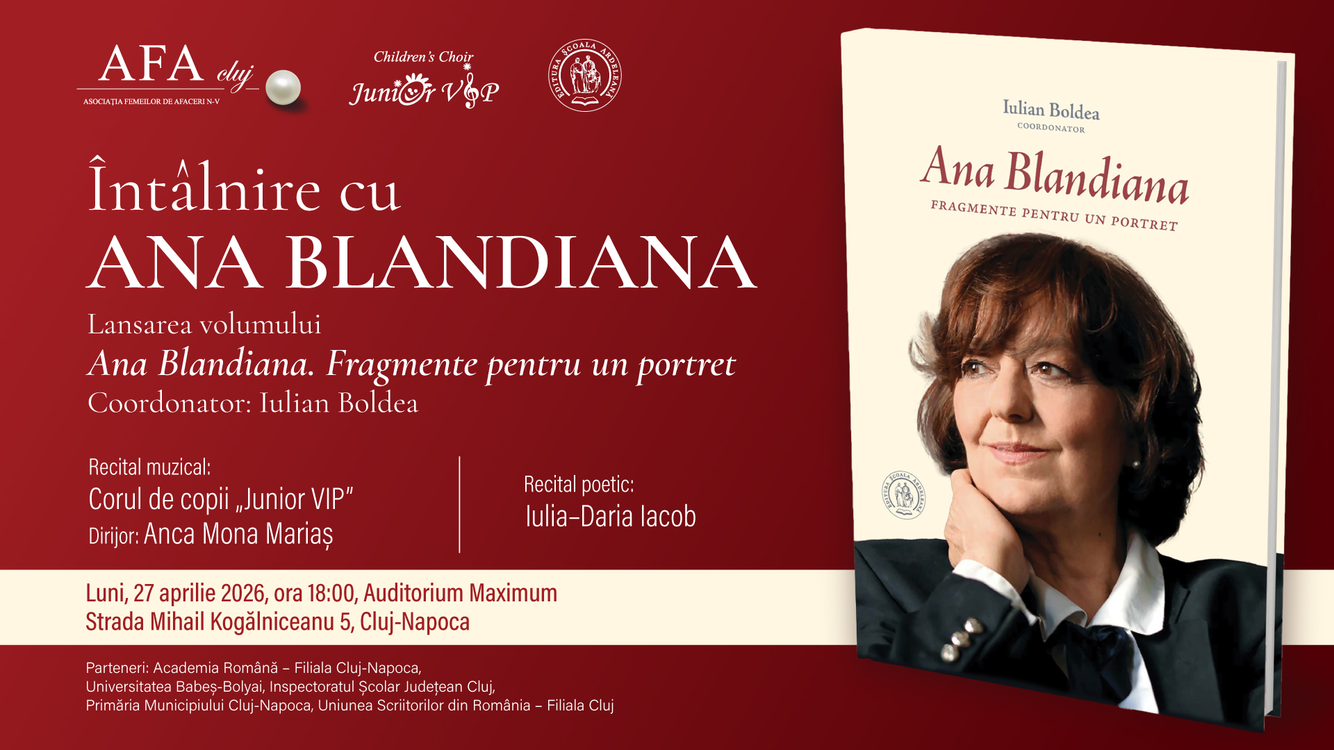 - 18:00 – Întâlnire cu Ana Blandiana – Auditorium Maximum