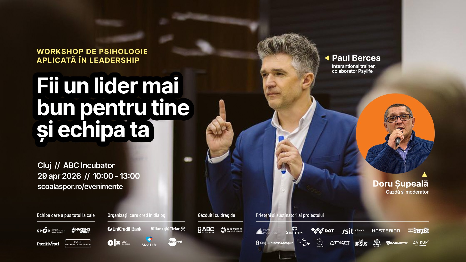 - 10:00 – Fii un lider bun: Workshop de psihologie aplicată în leadership cu Paul Bercea – ABC Incubator