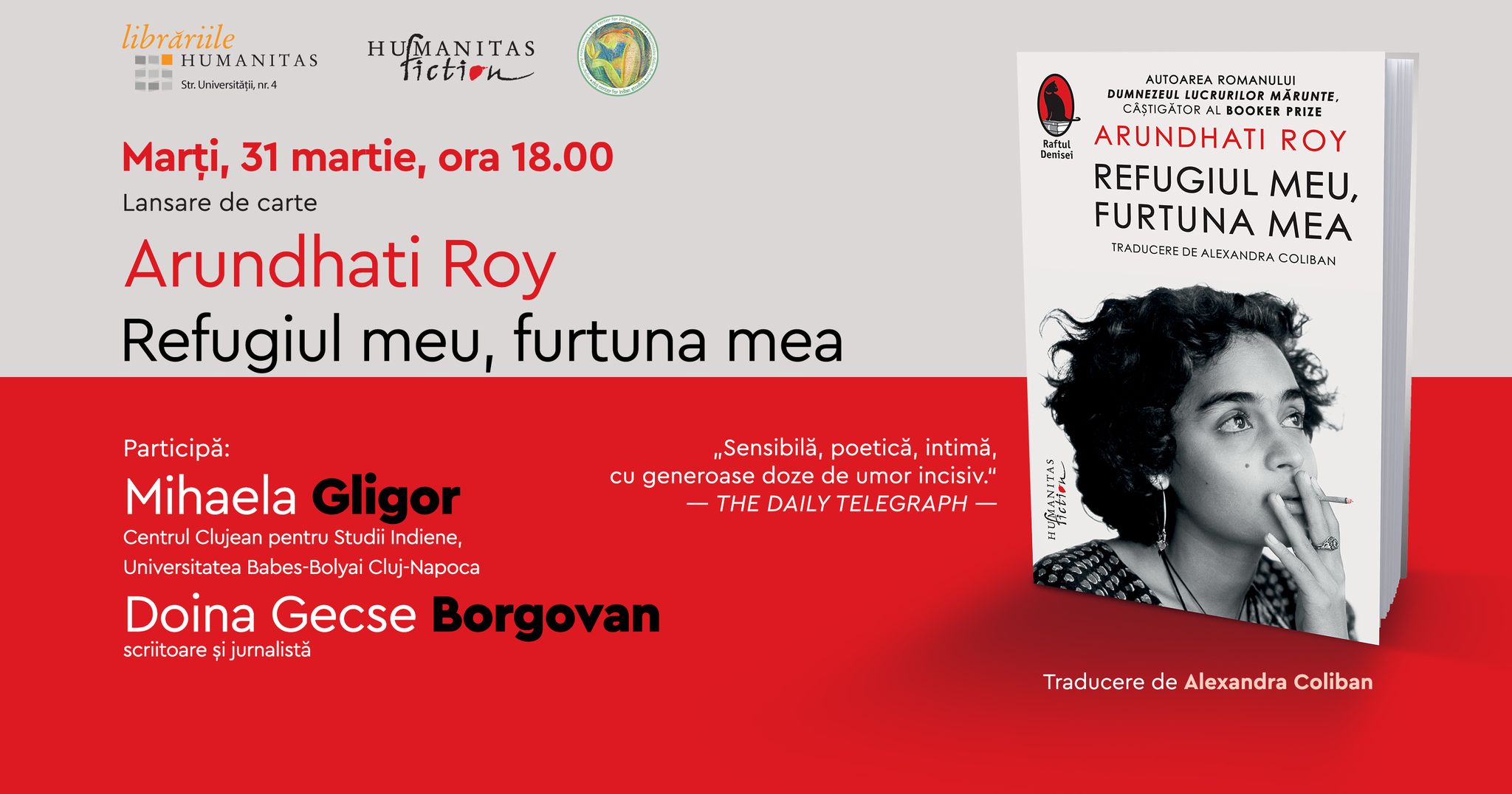 - 18:00 – Lansare de carte „Refugiul meu, furtuna mea” de Arundhati Roy – Librăria Humanitas Cluj