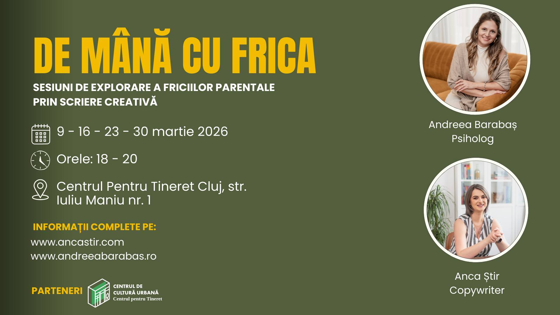 - 18:00 – De mână cu frica – sesiuni de explorare a fricilor parentale prin scriere creativă – Centrul pentru Tineret Cluj-Napoca