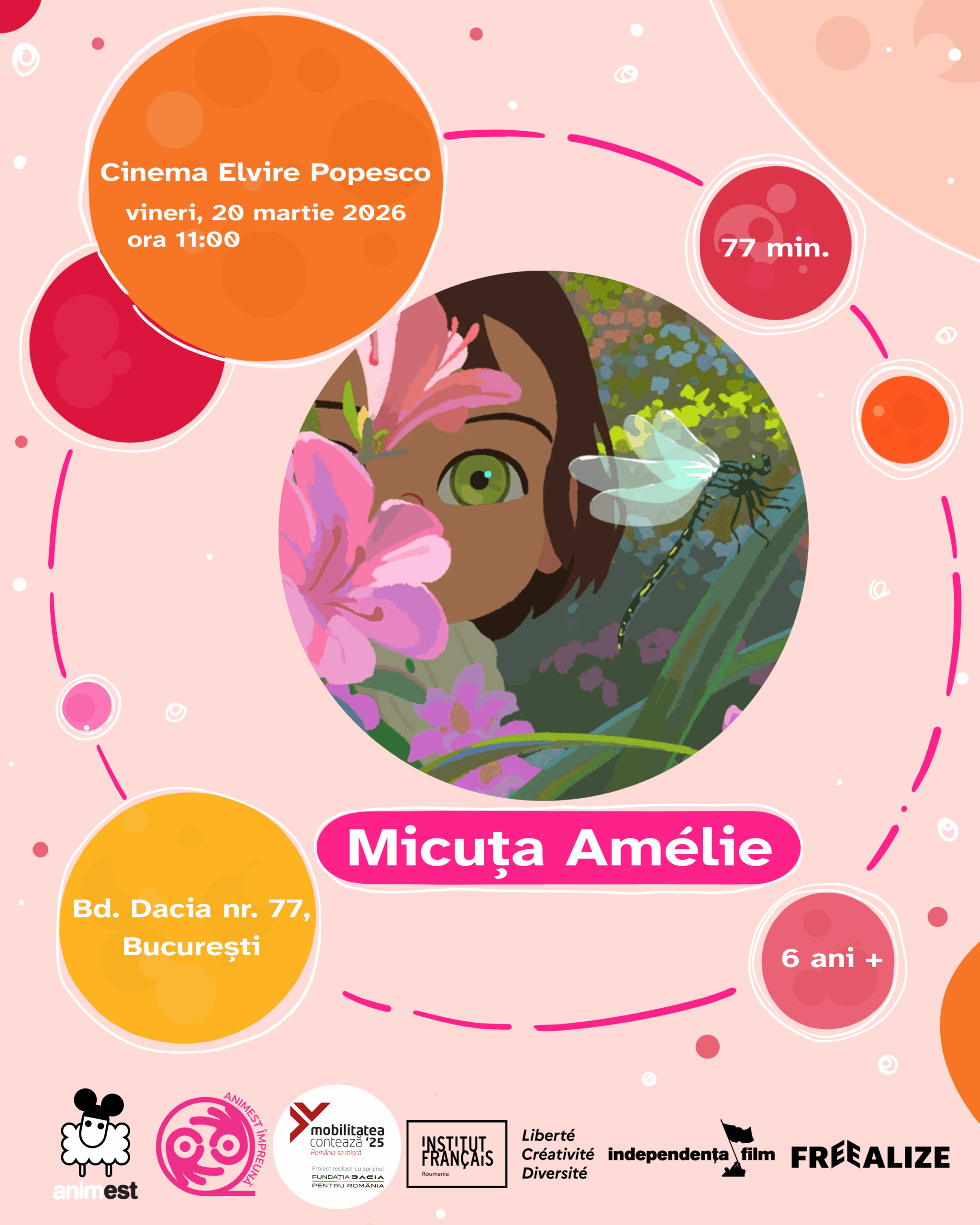 Debutul programului Animest SUPER va avea loc vineri 20 martie, la ora 11:00, în București, cu proiecția filmului Micuța Amélie (r. Maïlys Vallade, Liane-Cho Han), la Cinema Elvire Popesco, găzduită în slotul dedicat inițiativei europene Cinema fără bariere. Evenimentul, organizat chiar de Ziua Internațională a Francofoniei, propune o adaptare completă pentru abilități diverse: dublaj și subtitrări descriptive în română, interpretare în limba semnelor române și descriere audio în cască.
