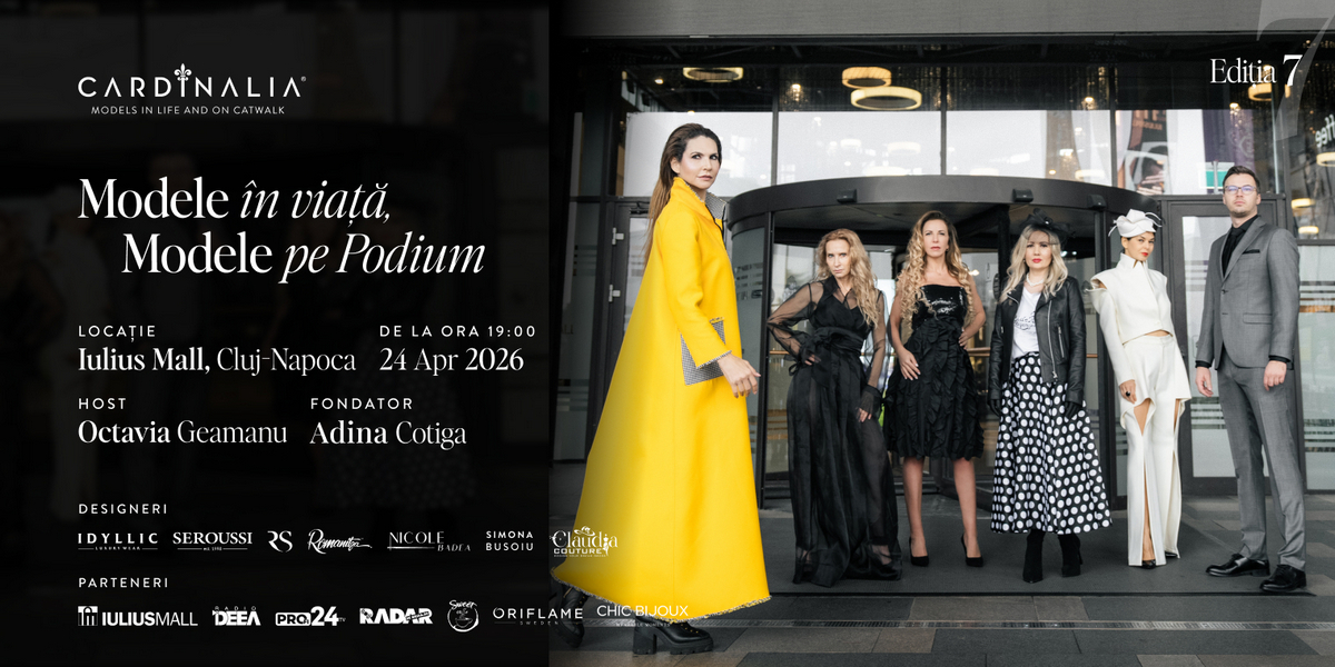 Un eveniment despre curaj și încurajare, o declarație despre reinventare și asumare, va avea loc vineri, 24 aprilie 2026, la Iulius Mall Cluj. Cardinalia aduce pe scenă 40 de medici, avocați, profesori și manageri, care vor păși pentru prima dată pe catwalk și vor aduce în fața publicului povești de viață inspiraționale. Printre invitații speciali se numără Romanița Iovan, Raluca Soare, Nicole Badea și Simona Bușoiu, iar Octavia Geamănu va fi gazda show-ului. Participarea este gratuită.