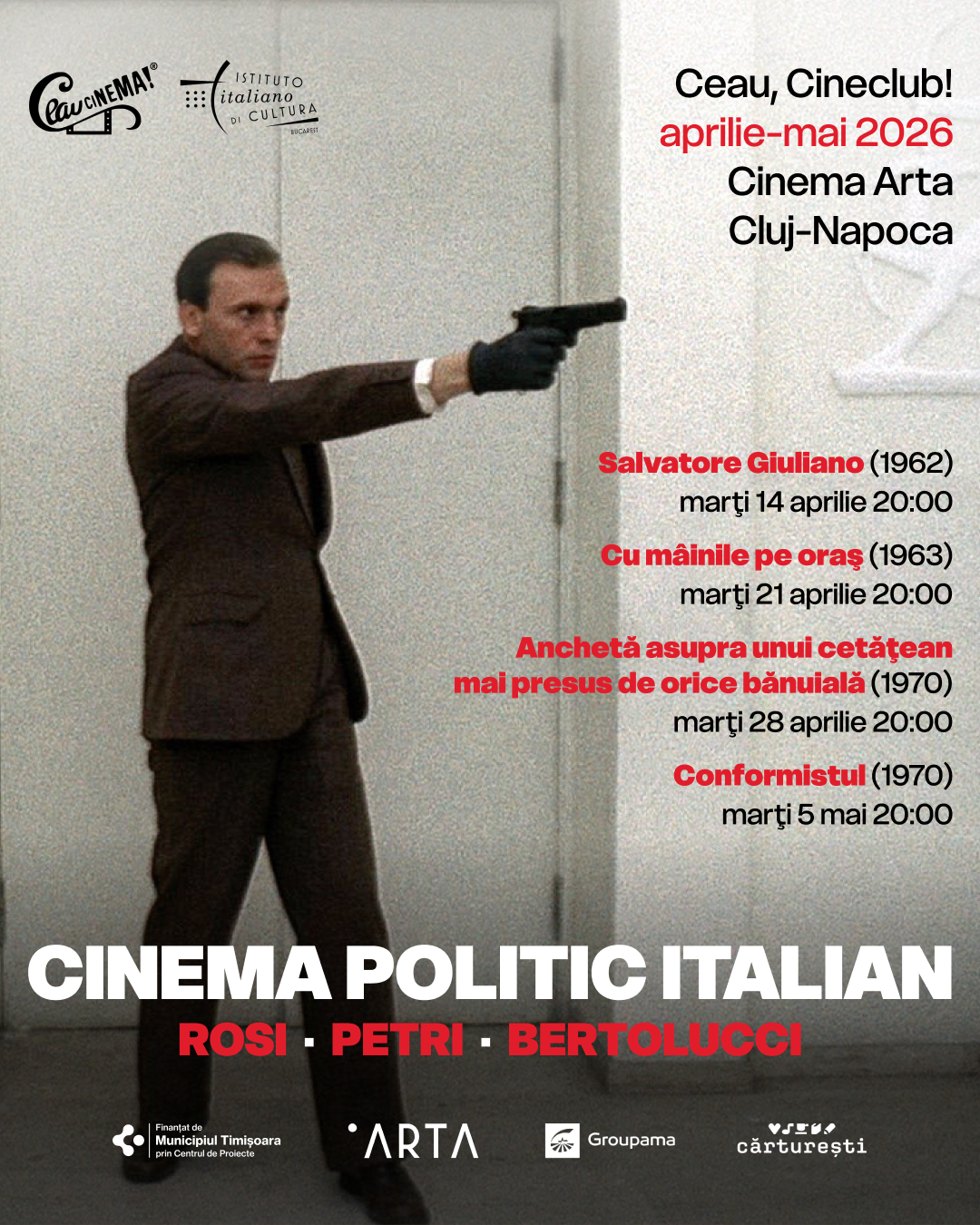 „Cinematografia din Italia a avut multe perioade de glorie în istoria sa. Dezvoltarea economică de după Al Doilea Război Mondial a venit pe fondul unor mişcări sociale şi scandaluri politice răsunătoare, multe dintre ele cu rădăcini adânci în perioada fascistă sau având legătură cu mafia. În acest context apărea în anii `60 fascinanta mişcare a cinemaului politic, care a produs timp de două decenii o serie de filme memorabile, realizate de o nouă generaţie de cineaşti ce îndrăzneau să abordeze fără menajamente cazuri şi personalităţi contemporane sau recente dintre cele mai scandaloase, într-un limbaj cinematografic inovator. Retrospectiva pe care am pregătit-o împreună cu partenerii de la Institutul Italian de Cultură din Bucureşti propune patru dintre filmele fundamentale ale acestui curent cinematografic unic. Într-un prezent ameninţător şi ale cărui probleme majore par să fie ocolite în mare măsură de cinematografia de autor mainstream, operele politice ale unor regizori ca Francesco Rosi, Elio Petri sau Bernardo Bertolucci ne reamintesc de forţa filmului de a trezi conştiinţe”, spune curatorul Ceau, Cineclub!, Ionuţ Mareş.