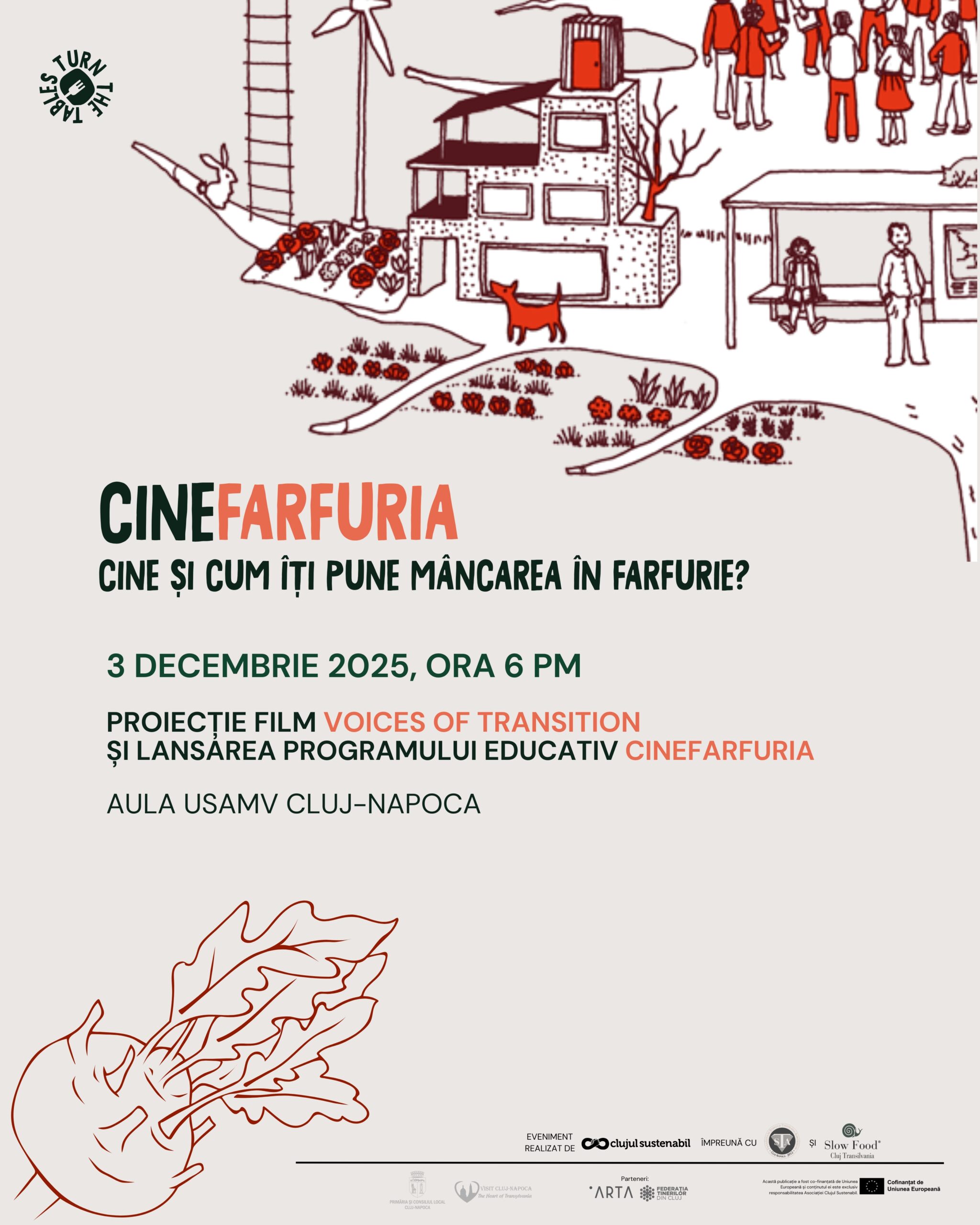 CINEFarfuria face parte din proiectul european Turn the Tables (TTT), inițiativă dedicată promovării hranei sustenabile în achizițiile publice și facilitării schimbării sistemice în sistemul alimentar. Proiectul este co-finanțat prin programul DEAR al Comisiei Europene și realizat cu sprijinul Primăriei și Consiliului Local Cluj-Napoca.