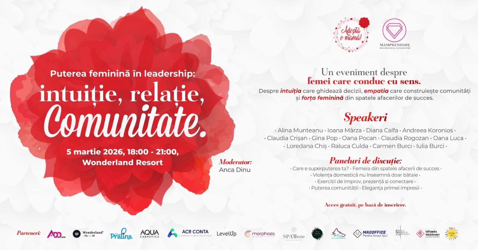 În luna martie, femeile din Cluj primesc mai mult decât flori și mărțișoare: primesc mesaje puternice de susținere și inspirație din partea unor voci feminine puternice, cu impact în societate. Pe 5 martie, conferința INFLORITOARE, ediția 2026, parte a campaniei „Adoptă o mamă” demarată de Mirela Retegan și Fundația Zurli în 2015, ajunge din nou la Cluj-Napoca, sub titlul ”Puterea feminină în leadership: intuiție, relație, comunitate”. Evenimentul va avea loc la Wonderland Resort, începând cu ora 18:00 și este organizat de Asociația Mamprenoare, împreună cu Fundația Zurli.