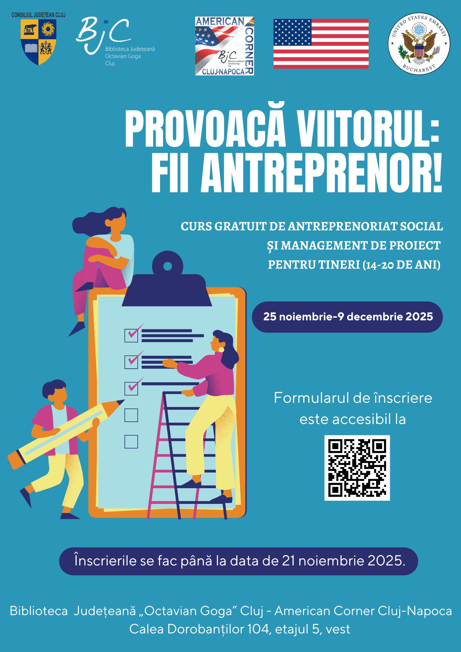 Biblioteca Judeţeană „Octavian Goga” Cluj, instituţie de cultură aflată sub autoritatea Consiliului Judeţean Cluj, organizează în perioada 25 noiembrie – 9 decembrie 2025 ediția din acest an a cursului gratuit de antreprenoriat social și management de proiect pentru tineri cu vârsta cuprinsă între 14 și 20 de ani „Provoacă viitorul: fii antreprenor!”.