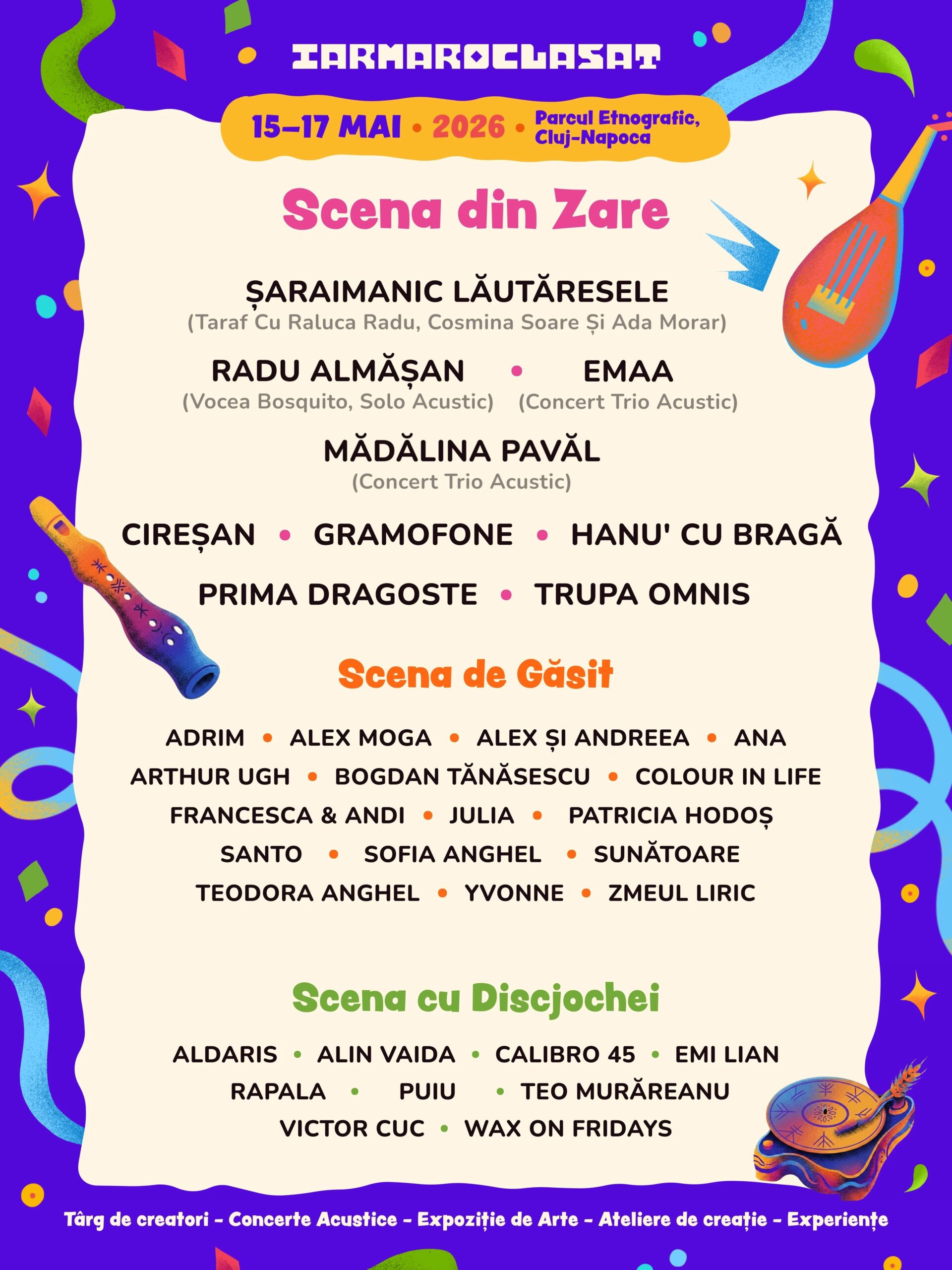 Pe 15, 16 și 17 Mai 2026, Parcul Etnografic Romulus Vuia din Cluj-Napoca deschide porțile pentru a treia ediție IARMAROC la Sat — Festivalul Creației și Artelor. Astăzi anunțăm programul complet: lineup-ul muzical pe trei scene, lista celor creatorilor prezenți la târg și finaliștii Concursului de Ceramică pe tema „Cucuteni”.