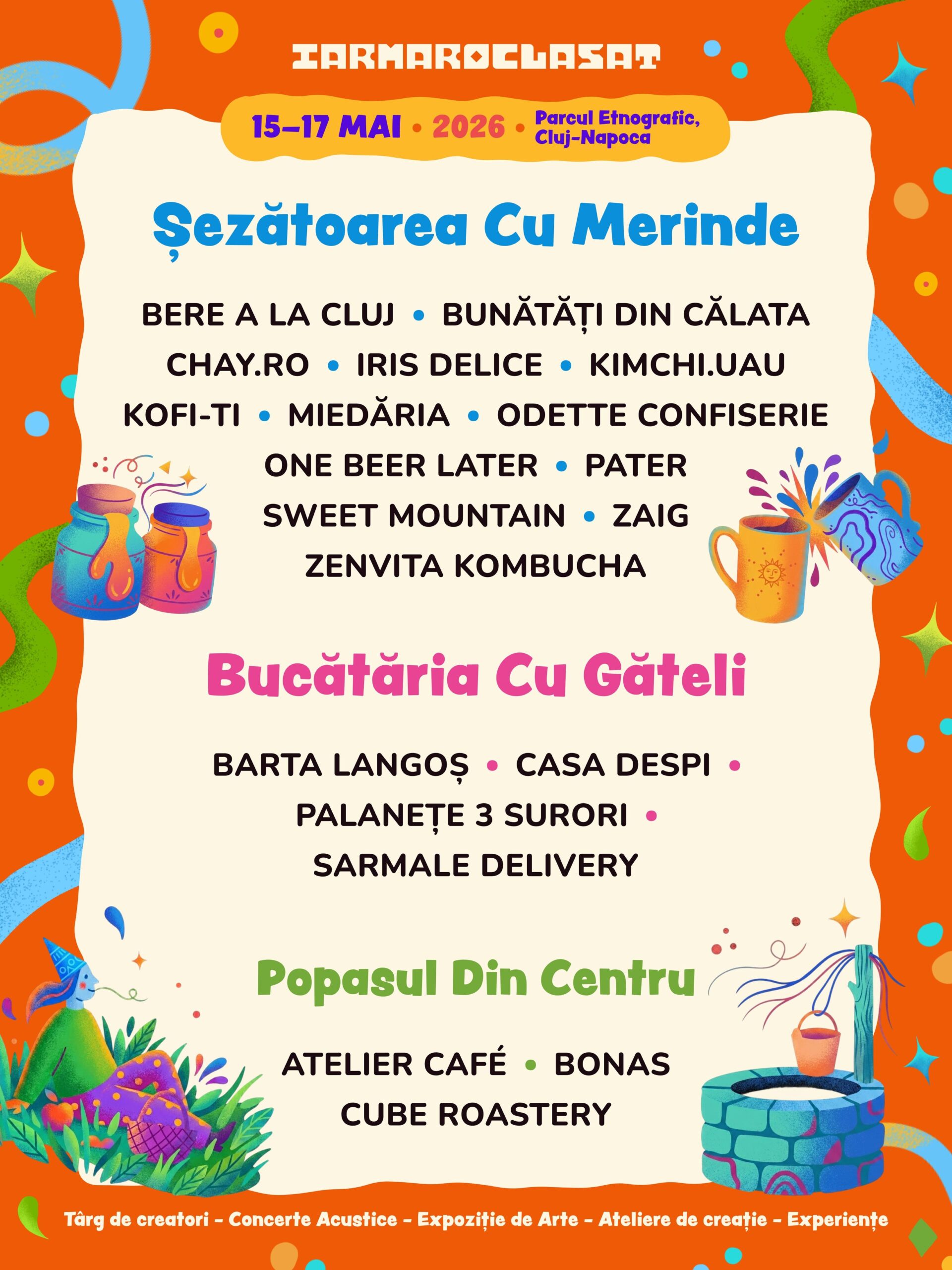 Pentru cei care vor ceva gătit pe loc — foodcourt-ul festivalului adună: Atelier Cafe · Bonas · CUBE Rostery · Casa Despi · Alimel · Barta Langoș · Sarmale Delivery · Palanețe 3 Surori