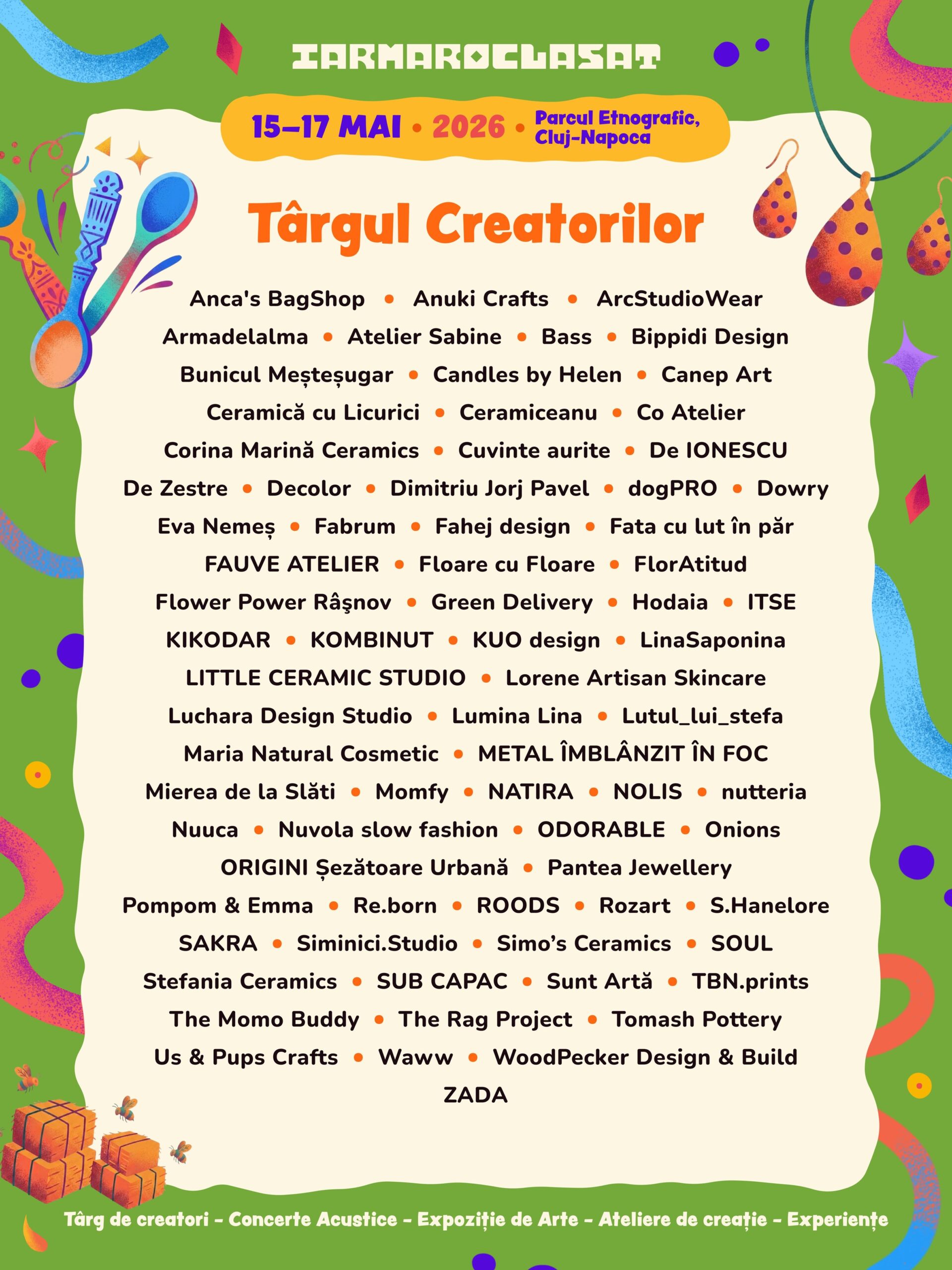 Printre creatorii confirmați până în prezent se numără: Anca’s BagShop · Anuki Crafts · ArcStudioWear · Armadelalma · Atelier Sabine · Bass · Bippidi Design · Bunicul Meșteșugar · Candles by Helen · Canep Art · Ceramică cu Licurici · Ceramiceanu · Co Atelier · Corina Marină Ceramics · Cuvinte aurite · De IONESCU · De Zestre · Decolor · Dimitriu Jorj Pavel · dogPRO · Dowry · Eva Nemeș · Fabrum · Fahej design · Fata cu lut în păr · FAUVE ATELIER · Floare cu Floare · FlorAtitud · Flower Power Râșnov · Green Delivery · Hodaia · ITSE · KIKODAR · KOMBINUT · KUO design · LinaSaponina · LITTLE CERAMIC STUDIO · Lorene Artisan Skincare · Luchara Design Studio · Lumina Lina · Lutul_lui_stefa · Maria Natural Cosmetic · METAL ÎMBLÂNZIT ÎN FOC · Mierea de la Slăți · Momfy · NATIRA · NOLIS · nutteria · Nuuca · Nuvola slow fashion · ODORABLE · Onions · ORIGINI Șezătoare Urbană · Pantea Jewellery · Pompom & Emma · Re.born · ROODS · Rozart · S.Hanelore · SAKRA · Siminici.Studio · Simo’s Ceramics · SOUL · Stefania Ceramics · SUB CAPAC · Sunt Artă · TBN.prints · The Momo Buddy · The Rag Project · Tomash Pottery · Us & Pups Crafts · Waww · WoodPecker Design & Build · ZADA · și încă mulți alții care sunt pe drum!