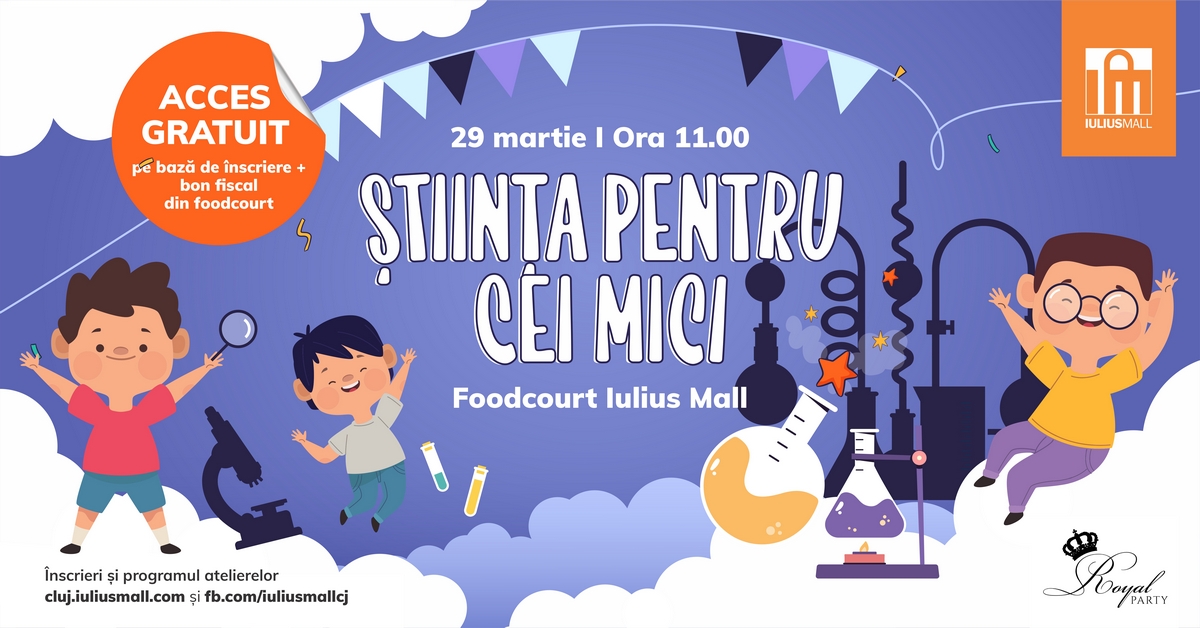 Duminică, copiii sunt invitați la o nouă ediție a atelierelor creative. De la ora 11:00, vor descoperi „Știința pentru cei mici”, în cadrul Kids Sundays. Accesul se face pe baza unui bon fiscal de la unul dintre operatorii din food court.