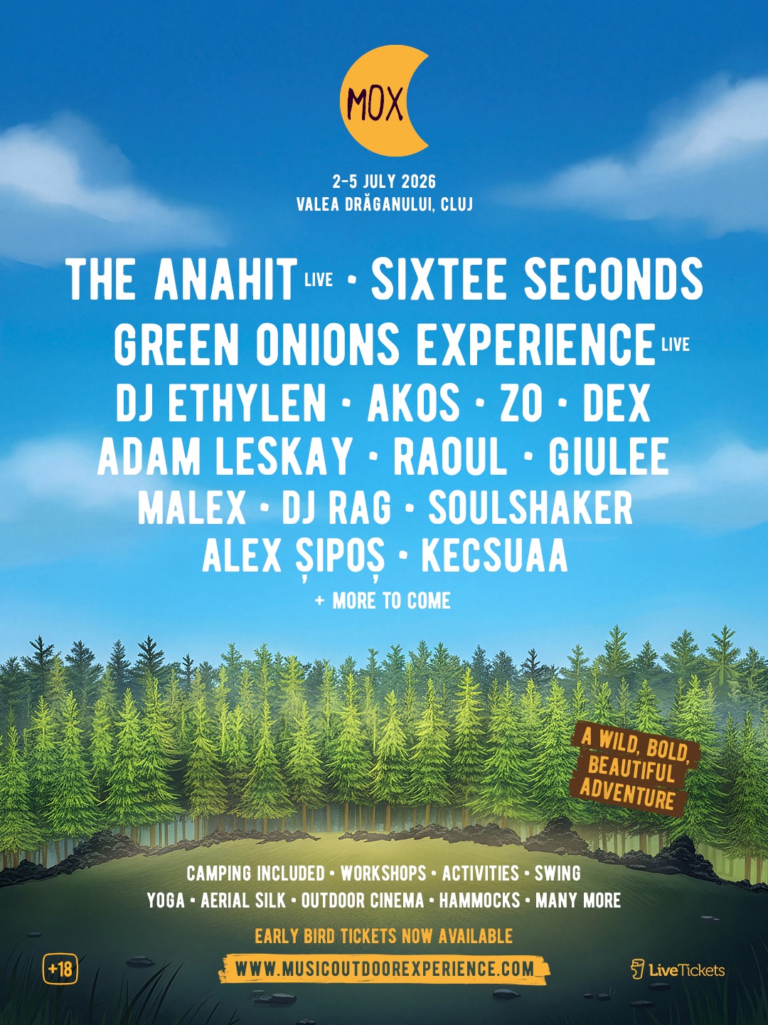 Abonamentele Early Bird pentru MOX 2026 sunt deja disponibile și includ acces pentru toate cele patru zile și patru nopți de festival + acces camping cu cortul. Biletele Early Bird pot fi achiziționate până la data de 8 martie 2026, inclusiv; după această dată, prețul va trece la următorul prag.