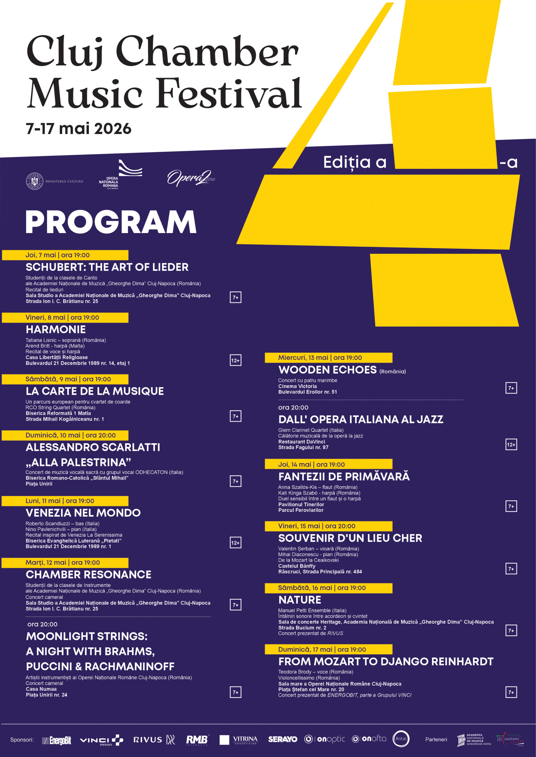 Cluj Chamber Music Festival continuă să dezvolte segmentul cameral și să propună o perspectivă actuală asupra acestuia, aducând muzica mai aproape de public și activând orașul printr-o rețea de spații și experiențe culturale. Biletele și abonamentele pot fi achiziționate online, de pe site-ul www.bilete.ro, și din Agenția de Bilete a Operei.