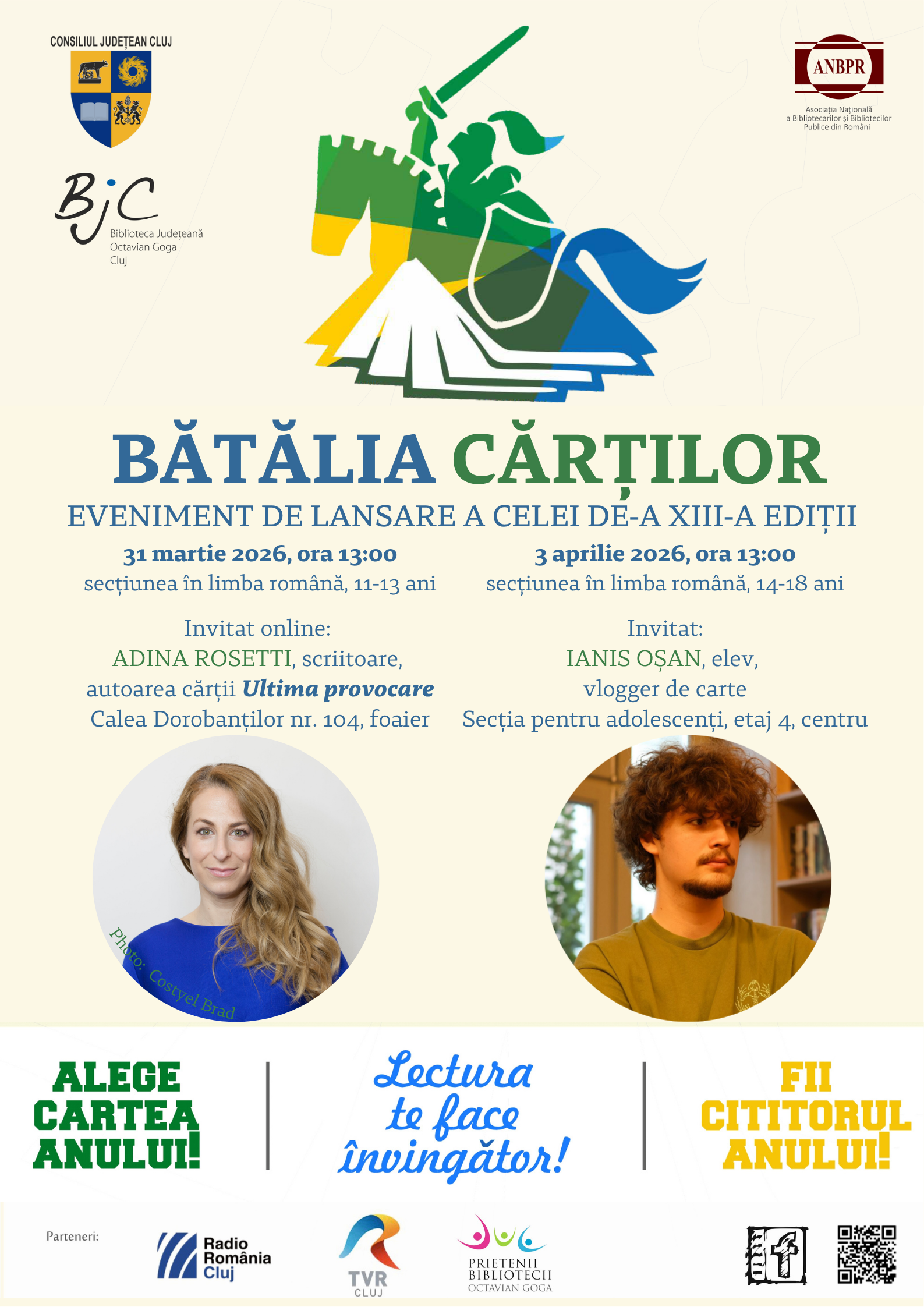 Biblioteca Judeţeană „Octavian Goga” Cluj, instituţie de cultură aflată sub autoritatea Consiliului Judeţean Cluj, lansează cea de-a XIII-a ediţie a Concursului Naţional de Lectură „Bătălia Cărților”, care are ca scop cultivarea gustului pentru lectură, dezvoltarea gândirii creative și critice și realizarea de conexiuni între iubitorii de carte.