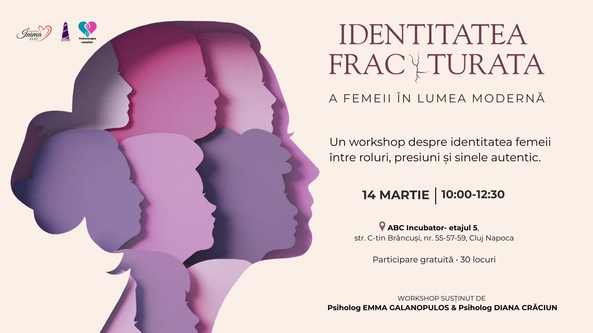 - 10:00 – Workshop Gratuit: Identitatea fracturată a femeii în lumea modernă – ABC Incubator, etajul 5