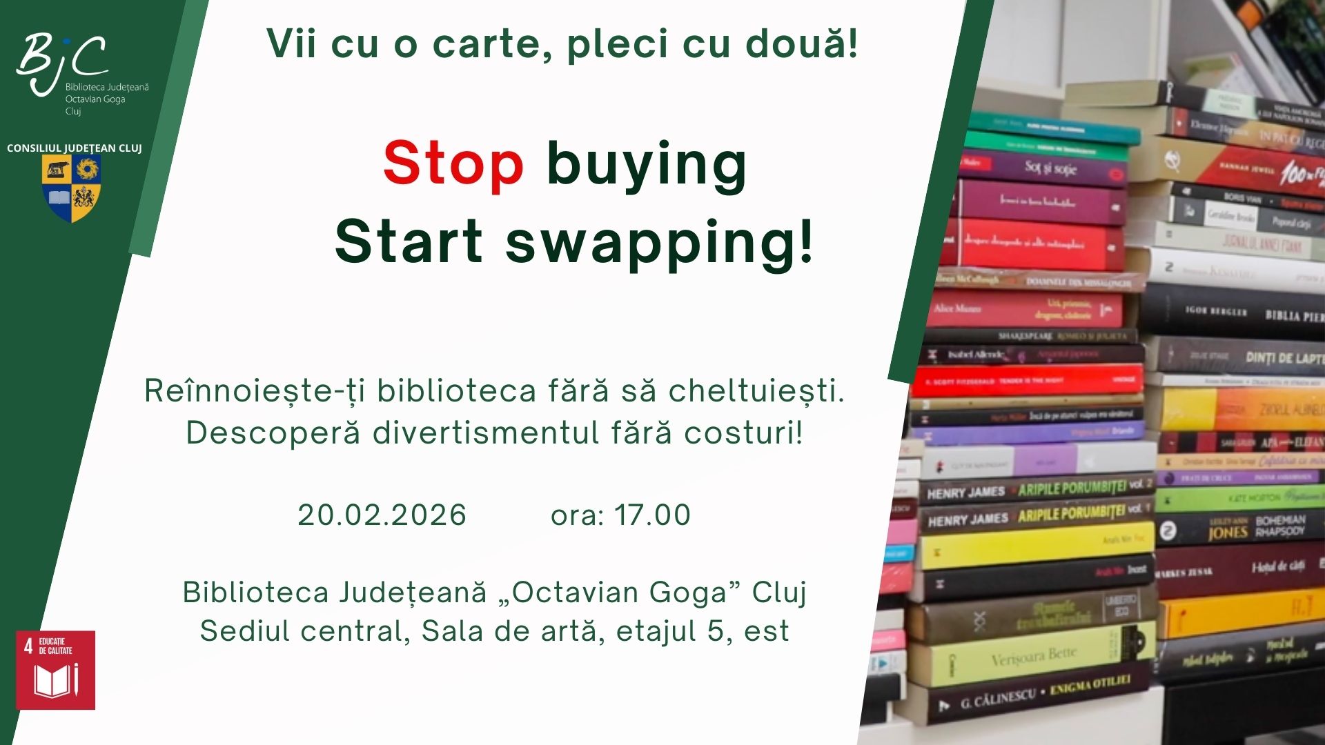 - 17:00 – 19:00 – Stop Buying. Start Swapping! – schimb de cărți – Biblioteca Judeţeană „Octavian Goga” Cluj