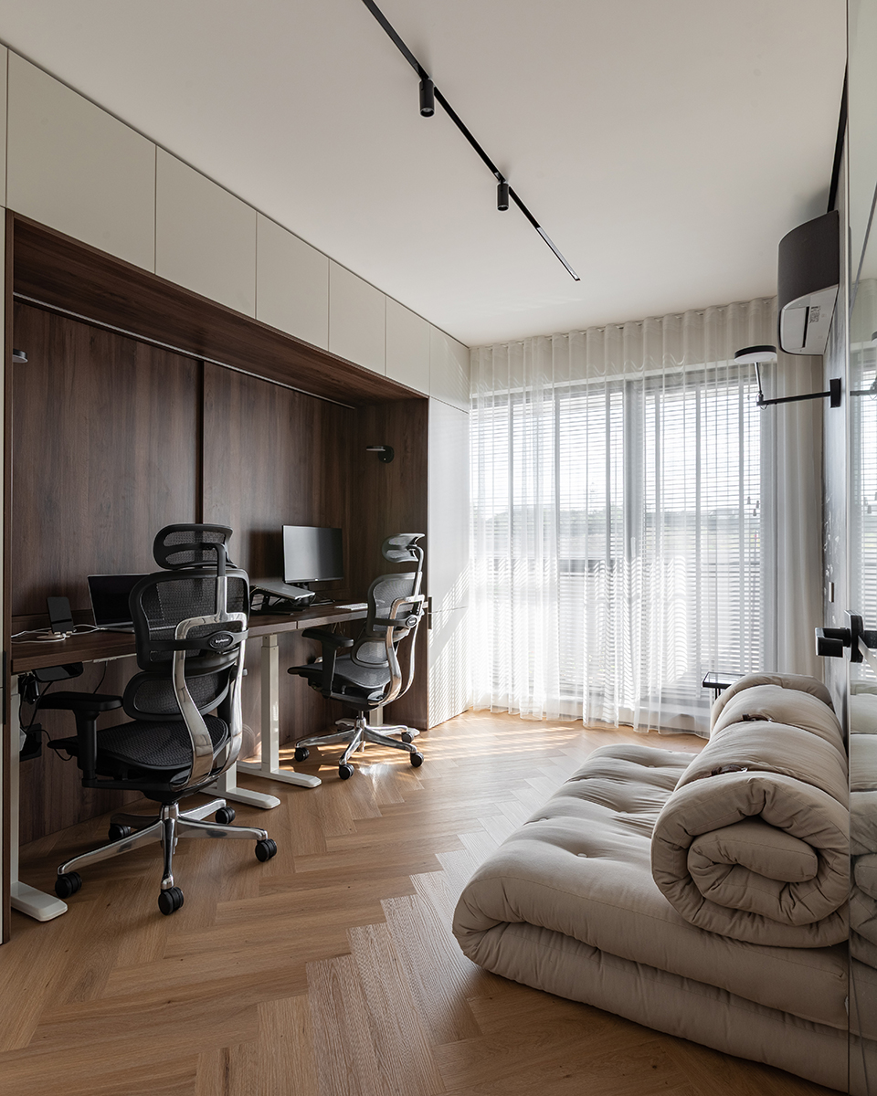 Amenajările propuse de Studio A pun accent pe organizarea clară a spațiului: zone de zi deschise și luminoase, spații de depozitare integrate discret, colțuri de lucru gândite astfel încât să nu domine întreaga locuință. Astfel, locuințele din Cluj, chiar și atunci când nu sunt foarte ample, capătă coerență și un ritm interior firesc, cu circulații fluide și locuri „moarte” reduse la minimum.