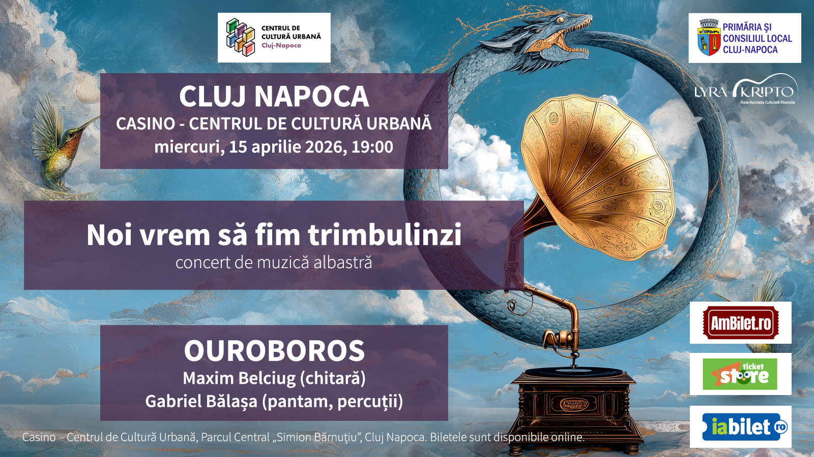 Intitulat „Noi vrem să fim trimbulinzi”, concertul extraordinar pe care Maxim Belciug și Gabriel Bălașa îl susțin miercuri, 15 aprilie 2026, la Cluj, are loc la Casino Centrul de Cultură Urbană, din parcul Parcul Central „Simion Bărnuțiu”, și începe la ora 19 :00. Biletele sunt disponibile online, pe ambilet.ro, ticketstore.ro și iabilet.ro.