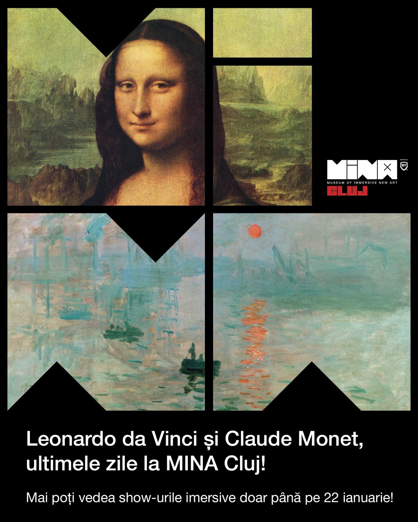 Vizitatorii mai pot vedea două dintre cele mai îndrăgite show-uri ale anului trecut: ”Leonardo da Vinci – The Immersive Show” și ”Monet – The Immersive Experience”, până pe 22 ianuarie 2026. Experiențele au adus zeci de mii de oameni mai aproape de arta clasică, reinterpretată prin tehnologie și storytelling vizual. După această dată, cele două spectacole ies definitiv din programul MINA Cluj.